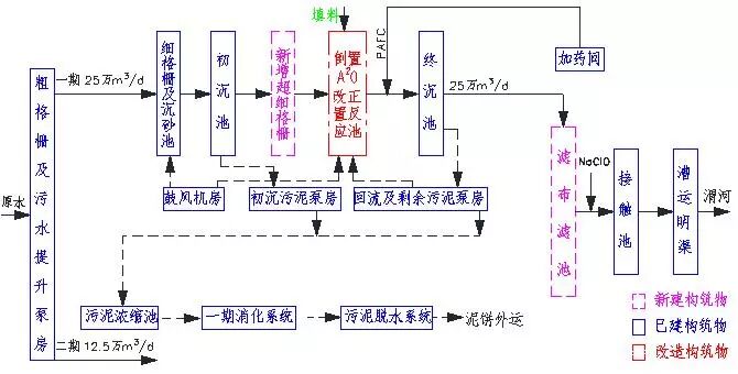 (1)升級改造工程盡可能發(fā)揮現(xiàn)有構(gòu)筑物的處理能力,減少土建施工工程量,縮短工期,降低對水廠正常生產(chǎn)運行的影響。